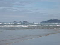 This is a truly beautiful place. We woke up this morning and decided to take our coffee and walk along the beach. Randi sat on a big log while Zev and I took a long walk. We looked for sand dollars and crabs and other assorted sea life. Zev picked up handfuls of sand dollars. He saved some kind of fish from impending doom by taking the small beast out of a tidal pool and throwing him back into the ocean. It was a very pleasurable walk. Soon we were joined by Josh and the three of us walked back to Randi. We sat for a while then Randi and I decided to head back to the campground for breakfast. The kids said they’d be right behind us. Well Randi and I had some cereal, relaxed a bit, and started packing up the van… still no children, aahhh. I guess we should check on them, though, so I head back to the beach. There they are, in their pajamas, playing in the sand and water, having the time of their lives. We realize its getting late, though, around noon, and we really should move on. Our plan is to head to Randi’s uncle’s house today, about an hour inland, to Silverton, OR. We’ve had a wonderfully relaxing morning, though.. the Oregon coast is just beautiful.